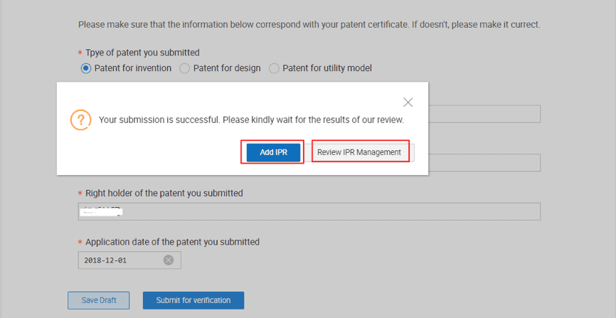 Step 5: You may click “Add IPR” to submit more IPR information or review IPR Management once you submit the verification request successfully.