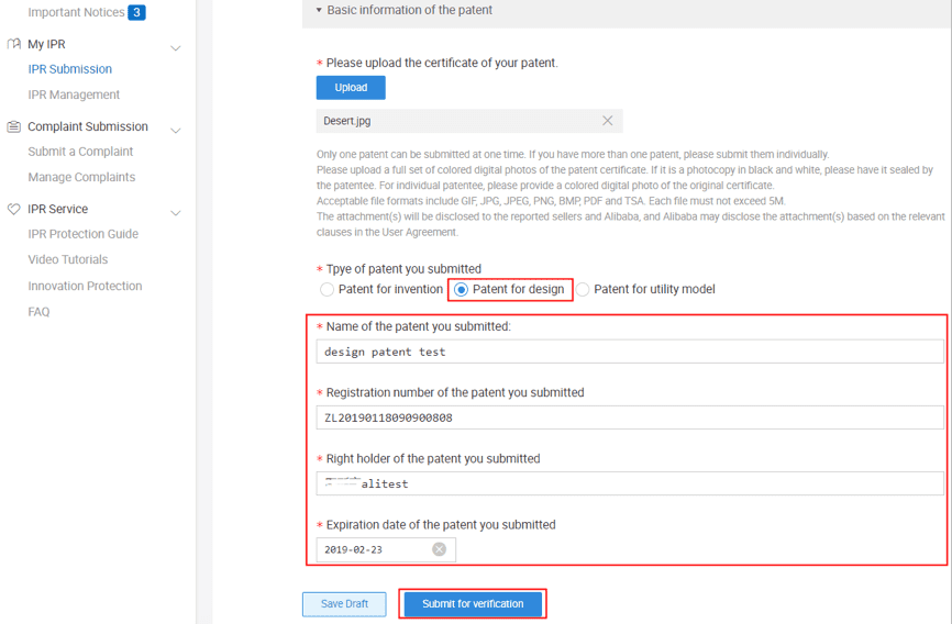 2. Please choose type of patent as “Patent for design” and fill in the details of your design patent according to the information indicated in your original design patent registration certificate you have uploaded. Then, please click “Submit for verification” button to submit the verification request of your patent information (see screenshot below).